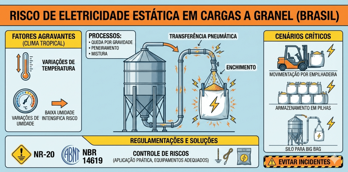 Cargas a granel, por sua natureza, são particularmente propensas ao acúmulo de eletricidade estática durante processos de transferência pneumática, queda por gravidade, peneiramento, mistura ou mesmo durante o enchimento e esvaziamento de embalagens. Fatores agravantes no clima tropical brasileiro, como as variações de umidade e temperatura, podem influenciar a dissipação ou o acúmulo de cargas. Embora a alta umidade possa, em tese, ajudar na dissipação, períodos de baixa umidade, comuns em certas regiões ou estações, intensificam drasticamente o risco. Cenários críticos incluem a transferência de produtos de um silo para um Big Bag, a movimentação de Big Bags por empilhadeiras e o armazenamento em pilhas, onde a proximidade de materiais pode exacerbar o risco. As regulamentações brasileiras, como a NR-20 (Segurança e Saúde no Trabalho com Inflamáveis e Combustíveis) e a ABNT NBR 14619 (Embalagens – Big bags – Requisitos e métodos de ensaio), já abordam a necessidade de controle de riscos, incluindo a eletricidade estática, mas a aplicação prática e a escolha de equipamentos adequados são cruciais para evitar os inúmeros incidentes registrados anualmente no setor.